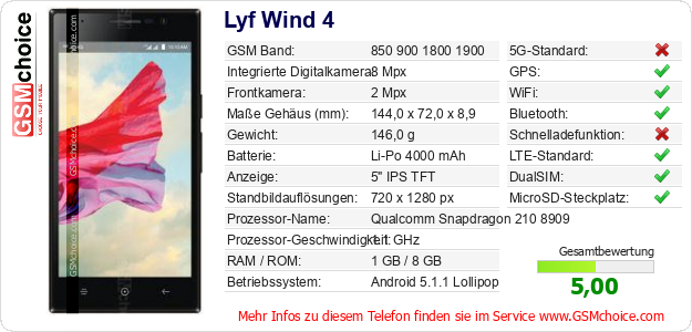 Hast du eigene Webseite? Willst du die Informationen über Standarddaten des Handys Lyf Wind 4 irgendwo veröffentlichen? Das ist sehr einfach. Du kannst das Bild herunterladen oder kopieren und auf der Webseite folgenden Code hinzufügen:Das Einfügen von diesem Code verursacht das Anzeigen von dem folgenden Bild: