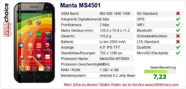 Hast du eigene Webseite? Willst du die Informationen über Standarddaten des Handys Manta MS4501 irgendwo veröffentlichen? Das ist sehr einfach. Du kannst das Bild herunterladen oder kopieren und auf der Webseite folgenden Code hinzufügen:Das Einfügen von diesem Code verursacht das Anzeigen von dem folgenden Bild: