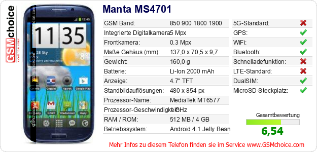 Hast du eigene Webseite? Willst du die Informationen über Standarddaten des Handys Manta MS4701 irgendwo veröffentlichen? Das ist sehr einfach. Du kannst das Bild herunterladen oder kopieren und auf der Webseite folgenden Code hinzufügen:Das Einfügen von diesem Code verursacht das Anzeigen von dem folgenden Bild: