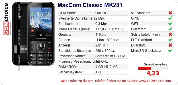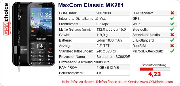 Hast du eigene Webseite? Willst du die Informationen über Standarddaten des Handys MaxCom Classic MK281 irgendwo veröffentlichen? Das ist sehr einfach. Du kannst das Bild herunterladen oder kopieren und auf der Webseite folgenden Code hinzufügen:Das Einfügen von diesem Code verursacht das Anzeigen von dem folgenden Bild: