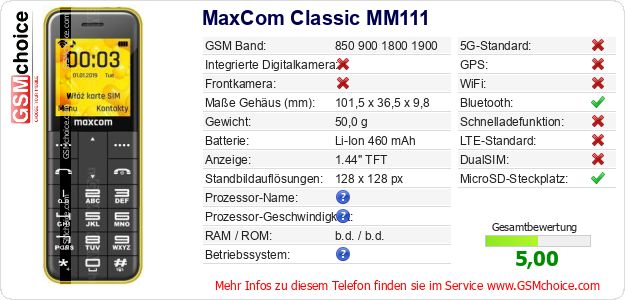 Hast du eigene Webseite? Willst du die Informationen über Standarddaten des Handys MaxCom Classic MM111 irgendwo veröffentlichen? Das ist sehr einfach. Du kannst das Bild herunterladen oder kopieren und auf der Webseite folgenden Code hinzufügen:Das Einfügen von diesem Code verursacht das Anzeigen von dem folgenden Bild: