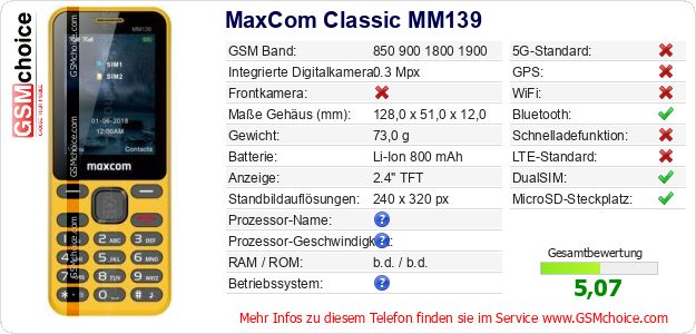Hast du eigene Webseite? Willst du die Informationen über Standarddaten des Handys MaxCom Classic MM139 irgendwo veröffentlichen? Das ist sehr einfach. Du kannst das Bild herunterladen oder kopieren und auf der Webseite folgenden Code hinzufügen:Das Einfügen von diesem Code verursacht das Anzeigen von dem folgenden Bild: