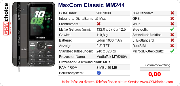 Hast du eigene Webseite? Willst du die Informationen über Standarddaten des Handys MaxCom Classic MM244 irgendwo veröffentlichen? Das ist sehr einfach. Du kannst das Bild herunterladen oder kopieren und auf der Webseite folgenden Code hinzufügen:Das Einfügen von diesem Code verursacht das Anzeigen von dem folgenden Bild: