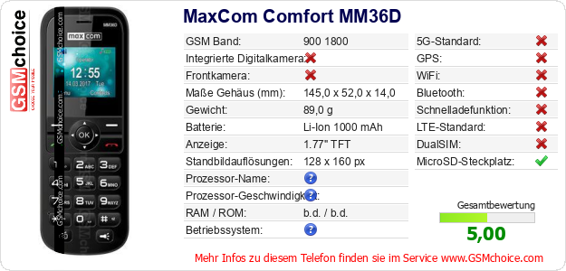 Hast du eigene Webseite? Willst du die Informationen über Standarddaten des Handys MaxCom Comfort MM36D irgendwo veröffentlichen? Das ist sehr einfach. Du kannst das Bild herunterladen oder kopieren und auf der Webseite folgenden Code hinzufügen:Das Einfügen von diesem Code verursacht das Anzeigen von dem folgenden Bild: