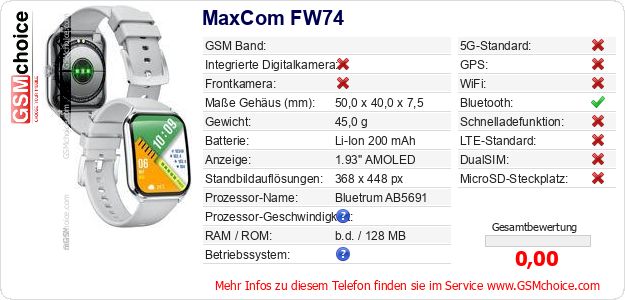 Hast du eigene Webseite? Willst du die Informationen über Standarddaten des Handys MaxCom FW74 irgendwo veröffentlichen? Das ist sehr einfach. Du kannst das Bild herunterladen oder kopieren und auf der Webseite folgenden Code hinzufügen:Das Einfügen von diesem Code verursacht das Anzeigen von dem folgenden Bild:
