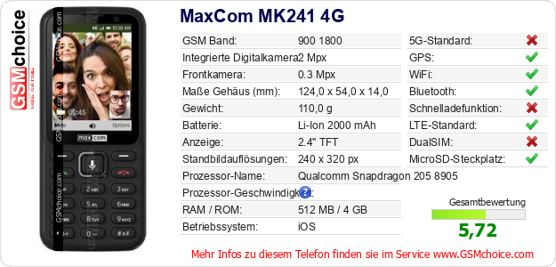 Hast du eigene Webseite? Willst du die Informationen über Standarddaten des Handys MaxCom MK241 4G irgendwo veröffentlichen? Das ist sehr einfach. Du kannst das Bild herunterladen oder kopieren und auf der Webseite folgenden Code hinzufügen:Das Einfügen von diesem Code verursacht das Anzeigen von dem folgenden Bild: