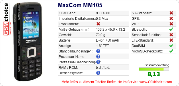 Hast du eigene Webseite? Willst du die Informationen über Standarddaten des Handys MaxCom MM105 irgendwo veröffentlichen? Das ist sehr einfach. Du kannst das Bild herunterladen oder kopieren und auf der Webseite folgenden Code hinzufügen:Das Einfügen von diesem Code verursacht das Anzeigen von dem folgenden Bild: