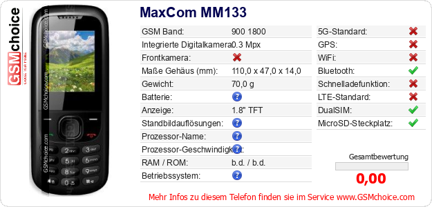 Hast du eigene Webseite? Willst du die Informationen über Standarddaten des Handys MaxCom MM133 irgendwo veröffentlichen? Das ist sehr einfach. Du kannst das Bild herunterladen oder kopieren und auf der Webseite folgenden Code hinzufügen:Das Einfügen von diesem Code verursacht das Anzeigen von dem folgenden Bild: