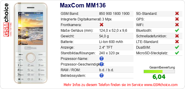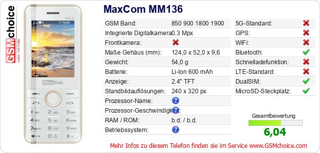 Hast du eigene Webseite? Willst du die Informationen über Standarddaten des Handys MaxCom MM136 irgendwo veröffentlichen? Das ist sehr einfach. Du kannst das Bild herunterladen oder kopieren und auf der Webseite folgenden Code hinzufügen:Das Einfügen von diesem Code verursacht das Anzeigen von dem folgenden Bild: