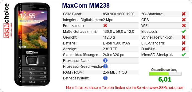 Hast du eigene Webseite? Willst du die Informationen über Standarddaten des Handys MaxCom MM238 irgendwo veröffentlichen? Das ist sehr einfach. Du kannst das Bild herunterladen oder kopieren und auf der Webseite folgenden Code hinzufügen:Das Einfügen von diesem Code verursacht das Anzeigen von dem folgenden Bild: