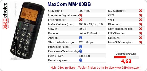 Hast du eigene Webseite? Willst du die Informationen über Standarddaten des Handys MaxCom MM400BB irgendwo veröffentlichen? Das ist sehr einfach. Du kannst das Bild herunterladen oder kopieren und auf der Webseite folgenden Code hinzufügen:Das Einfügen von diesem Code verursacht das Anzeigen von dem folgenden Bild: