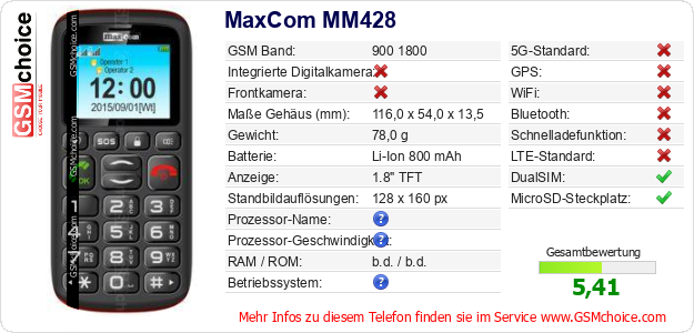 Hast du eigene Webseite? Willst du die Informationen über Standarddaten des Handys MaxCom MM428 irgendwo veröffentlichen? Das ist sehr einfach. Du kannst das Bild herunterladen oder kopieren und auf der Webseite folgenden Code hinzufügen:Das Einfügen von diesem Code verursacht das Anzeigen von dem folgenden Bild: