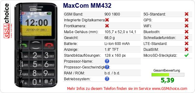 Hast du eigene Webseite? Willst du die Informationen über Standarddaten des Handys MaxCom MM432 irgendwo veröffentlichen? Das ist sehr einfach. Du kannst das Bild herunterladen oder kopieren und auf der Webseite folgenden Code hinzufügen:Das Einfügen von diesem Code verursacht das Anzeigen von dem folgenden Bild: