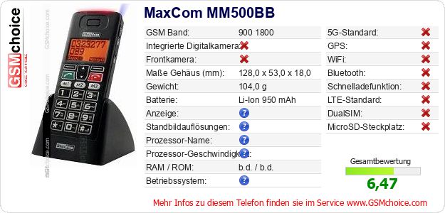 Hast du eigene Webseite? Willst du die Informationen über Standarddaten des Handys MaxCom MM500BB irgendwo veröffentlichen? Das ist sehr einfach. Du kannst das Bild herunterladen oder kopieren und auf der Webseite folgenden Code hinzufügen:Das Einfügen von diesem Code verursacht das Anzeigen von dem folgenden Bild: