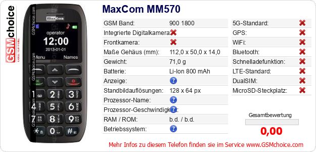 Hast du eigene Webseite? Willst du die Informationen über Standarddaten des Handys MaxCom MM570 irgendwo veröffentlichen? Das ist sehr einfach. Du kannst das Bild herunterladen oder kopieren und auf der Webseite folgenden Code hinzufügen:Das Einfügen von diesem Code verursacht das Anzeigen von dem folgenden Bild: