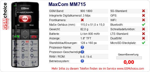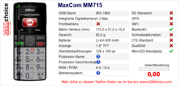 Hast du eigene Webseite? Willst du die Informationen über Standarddaten des Handys MaxCom MM715 irgendwo veröffentlichen? Das ist sehr einfach. Du kannst das Bild herunterladen oder kopieren und auf der Webseite folgenden Code hinzufügen:Das Einfügen von diesem Code verursacht das Anzeigen von dem folgenden Bild: