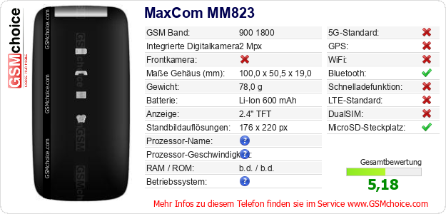 Hast du eigene Webseite? Willst du die Informationen über Standarddaten des Handys MaxCom MM823 irgendwo veröffentlichen? Das ist sehr einfach. Du kannst das Bild herunterladen oder kopieren und auf der Webseite folgenden Code hinzufügen:Das Einfügen von diesem Code verursacht das Anzeigen von dem folgenden Bild:
