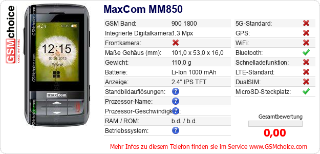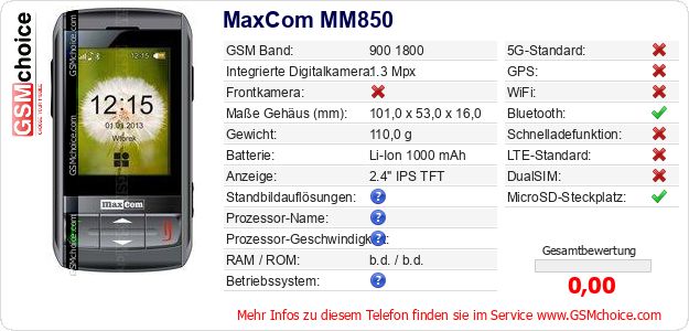Hast du eigene Webseite? Willst du die Informationen über Standarddaten des Handys MaxCom MM850 irgendwo veröffentlichen? Das ist sehr einfach. Du kannst das Bild herunterladen oder kopieren und auf der Webseite folgenden Code hinzufügen:Das Einfügen von diesem Code verursacht das Anzeigen von dem folgenden Bild: