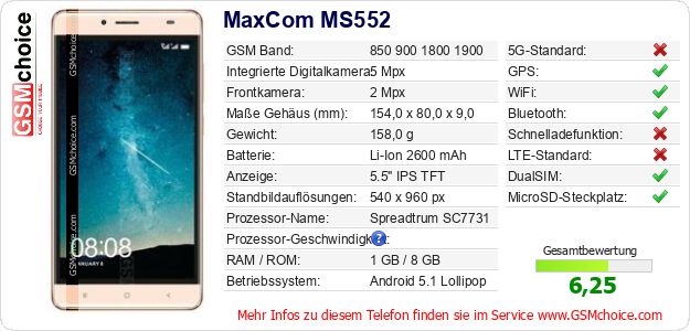 Hast du eigene Webseite? Willst du die Informationen über Standarddaten des Handys MaxCom MS552 irgendwo veröffentlichen? Das ist sehr einfach. Du kannst das Bild herunterladen oder kopieren und auf der Webseite folgenden Code hinzufügen:Das Einfügen von diesem Code verursacht das Anzeigen von dem folgenden Bild: