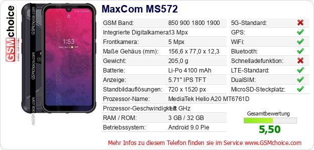 Hast du eigene Webseite? Willst du die Informationen über Standarddaten des Handys MaxCom MS572 irgendwo veröffentlichen? Das ist sehr einfach. Du kannst das Bild herunterladen oder kopieren und auf der Webseite folgenden Code hinzufügen:Das Einfügen von diesem Code verursacht das Anzeigen von dem folgenden Bild: