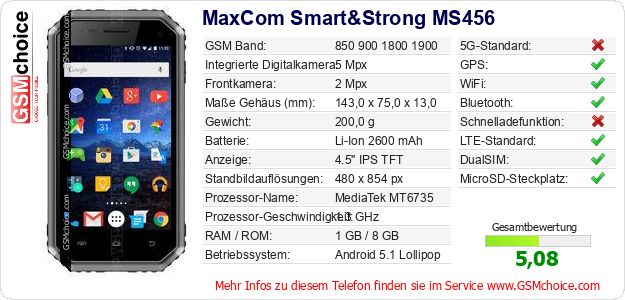 Hast du eigene Webseite? Willst du die Informationen über Standarddaten des Handys MaxCom Smart&Strong MS456 irgendwo veröffentlichen? Das ist sehr einfach. Du kannst das Bild herunterladen oder kopieren und auf der Webseite folgenden Code hinzufügen:Das Einfügen von diesem Code verursacht das Anzeigen von dem folgenden Bild: