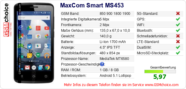 Hast du eigene Webseite? Willst du die Informationen über Standarddaten des Handys MaxCom Smart MS453 irgendwo veröffentlichen? Das ist sehr einfach. Du kannst das Bild herunterladen oder kopieren und auf der Webseite folgenden Code hinzufügen:Das Einfügen von diesem Code verursacht das Anzeigen von dem folgenden Bild: