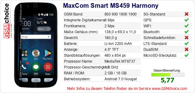 Hast du eigene Webseite? Willst du die Informationen über Standarddaten des Handys MaxCom Smart MS459 Harmony irgendwo veröffentlichen? Das ist sehr einfach. Du kannst das Bild herunterladen oder kopieren und auf der Webseite folgenden Code hinzufügen:Das Einfügen von diesem Code verursacht das Anzeigen von dem folgenden Bild: