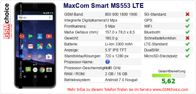 Hast du eigene Webseite? Willst du die Informationen über Standarddaten des Handys MaxCom Smart MS553 LTE irgendwo veröffentlichen? Das ist sehr einfach. Du kannst das Bild herunterladen oder kopieren und auf der Webseite folgenden Code hinzufügen:Das Einfügen von diesem Code verursacht das Anzeigen von dem folgenden Bild: