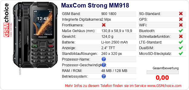 Hast du eigene Webseite? Willst du die Informationen über Standarddaten des Handys MaxCom Strong MM918 irgendwo veröffentlichen? Das ist sehr einfach. Du kannst das Bild herunterladen oder kopieren und auf der Webseite folgenden Code hinzufügen:Das Einfügen von diesem Code verursacht das Anzeigen von dem folgenden Bild: