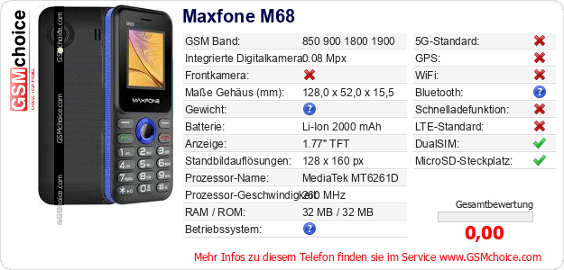 Hast du eigene Webseite? Willst du die Informationen über Standarddaten des Handys Maxfone M68 irgendwo veröffentlichen? Das ist sehr einfach. Du kannst das Bild herunterladen oder kopieren und auf der Webseite folgenden Code hinzufügen:Das Einfügen von diesem Code verursacht das Anzeigen von dem folgenden Bild: