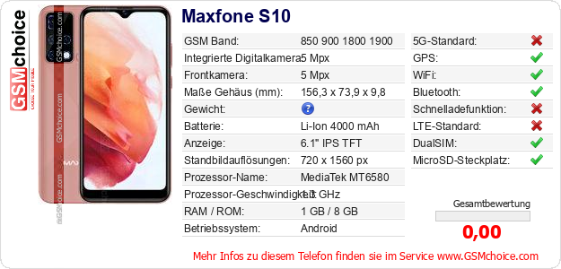 Hast du eigene Webseite? Willst du die Informationen über Standarddaten des Handys Maxfone S10 irgendwo veröffentlichen? Das ist sehr einfach. Du kannst das Bild herunterladen oder kopieren und auf der Webseite folgenden Code hinzufügen:Das Einfügen von diesem Code verursacht das Anzeigen von dem folgenden Bild: