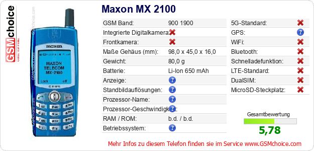Hast du eigene Webseite? Willst du die Informationen über Standarddaten des Handys Maxon MX 2100 irgendwo veröffentlichen? Das ist sehr einfach. Du kannst das Bild herunterladen oder kopieren und auf der Webseite folgenden Code hinzufügen:Das Einfügen von diesem Code verursacht das Anzeigen von dem folgenden Bild: