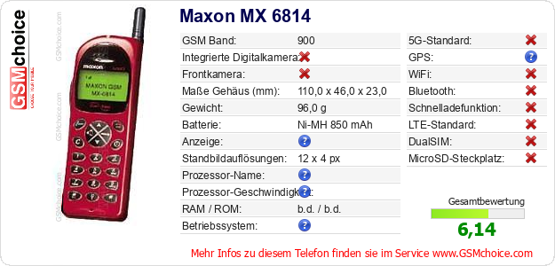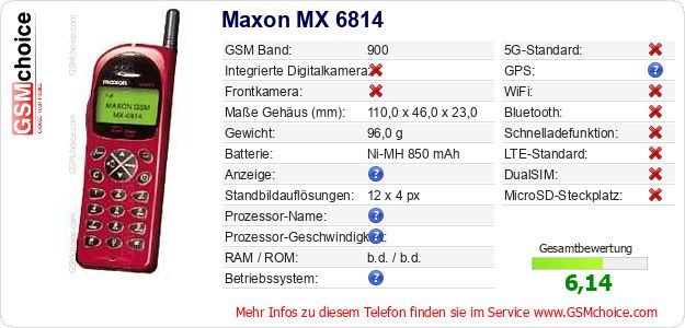 Hast du eigene Webseite? Willst du die Informationen über Standarddaten des Handys Maxon MX 6814 irgendwo veröffentlichen? Das ist sehr einfach. Du kannst das Bild herunterladen oder kopieren und auf der Webseite folgenden Code hinzufügen:Das Einfügen von diesem Code verursacht das Anzeigen von dem folgenden Bild: