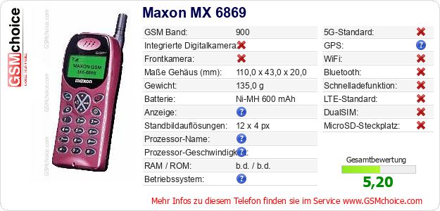 Daten des Mobiltelefons Maxon MX 6869 auf Ihrer Seite