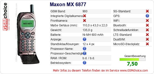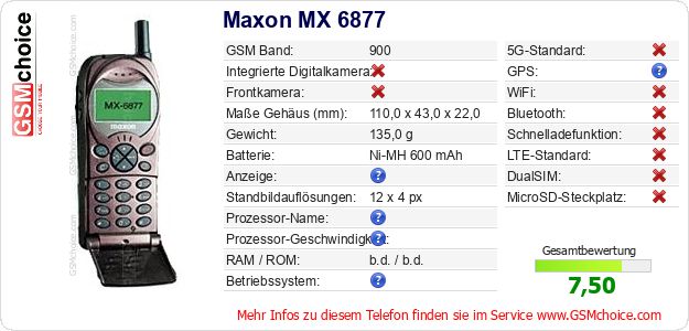 Hast du eigene Webseite? Willst du die Informationen über Standarddaten des Handys Maxon MX 6877 irgendwo veröffentlichen? Das ist sehr einfach. Du kannst das Bild herunterladen oder kopieren und auf der Webseite folgenden Code hinzufügen:Das Einfügen von diesem Code verursacht das Anzeigen von dem folgenden Bild: