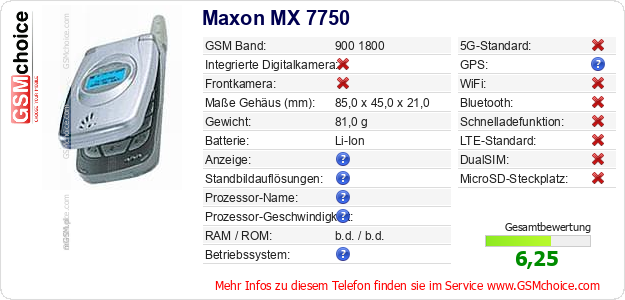 Hast du eigene Webseite? Willst du die Informationen über Standarddaten des Handys Maxon MX 7750 irgendwo veröffentlichen? Das ist sehr einfach. Du kannst das Bild herunterladen oder kopieren und auf der Webseite folgenden Code hinzufügen:Das Einfügen von diesem Code verursacht das Anzeigen von dem folgenden Bild: