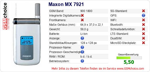 Hast du eigene Webseite? Willst du die Informationen über Standarddaten des Handys Maxon MX 7921 irgendwo veröffentlichen? Das ist sehr einfach. Du kannst das Bild herunterladen oder kopieren und auf der Webseite folgenden Code hinzufügen:Das Einfügen von diesem Code verursacht das Anzeigen von dem folgenden Bild: