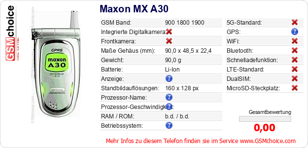Hast du eigene Webseite? Willst du die Informationen über Standarddaten des Handys Maxon MX A30 irgendwo veröffentlichen? Das ist sehr einfach. Du kannst das Bild herunterladen oder kopieren und auf der Webseite folgenden Code hinzufügen:Das Einfügen von diesem Code verursacht das Anzeigen von dem folgenden Bild: