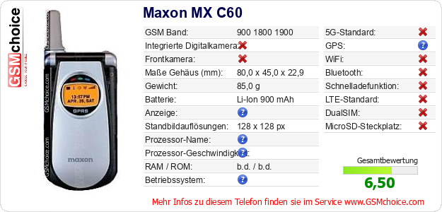 Hast du eigene Webseite? Willst du die Informationen über Standarddaten des Handys Maxon MX C60 irgendwo veröffentlichen? Das ist sehr einfach. Du kannst das Bild herunterladen oder kopieren und auf der Webseite folgenden Code hinzufügen:Das Einfügen von diesem Code verursacht das Anzeigen von dem folgenden Bild: