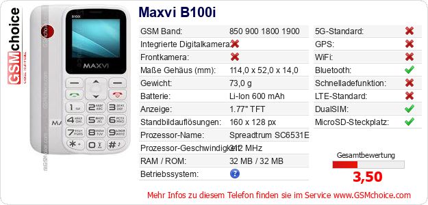 Hast du eigene Webseite? Willst du die Informationen über Standarddaten des Handys Maxvi B100i irgendwo veröffentlichen? Das ist sehr einfach. Du kannst das Bild herunterladen oder kopieren und auf der Webseite folgenden Code hinzufügen:Das Einfügen von diesem Code verursacht das Anzeigen von dem folgenden Bild:
