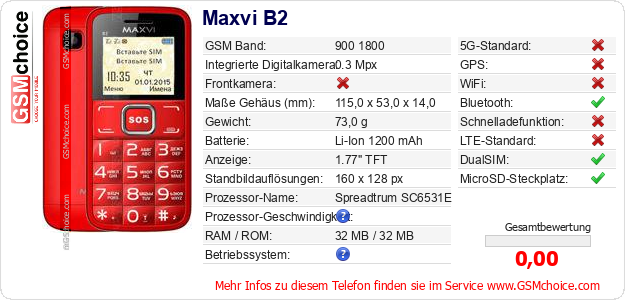 Hast du eigene Webseite? Willst du die Informationen über Standarddaten des Handys Maxvi B2 irgendwo veröffentlichen? Das ist sehr einfach. Du kannst das Bild herunterladen oder kopieren und auf der Webseite folgenden Code hinzufügen:Das Einfügen von diesem Code verursacht das Anzeigen von dem folgenden Bild: