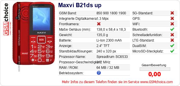 Hast du eigene Webseite? Willst du die Informationen über Standarddaten des Handys Maxvi B21ds up irgendwo veröffentlichen? Das ist sehr einfach. Du kannst das Bild herunterladen oder kopieren und auf der Webseite folgenden Code hinzufügen:Das Einfügen von diesem Code verursacht das Anzeigen von dem folgenden Bild: