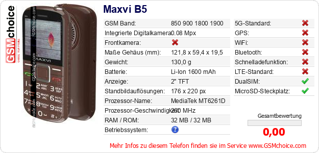 Hast du eigene Webseite? Willst du die Informationen über Standarddaten des Handys Maxvi B5 irgendwo veröffentlichen? Das ist sehr einfach. Du kannst das Bild herunterladen oder kopieren und auf der Webseite folgenden Code hinzufügen:Das Einfügen von diesem Code verursacht das Anzeigen von dem folgenden Bild: