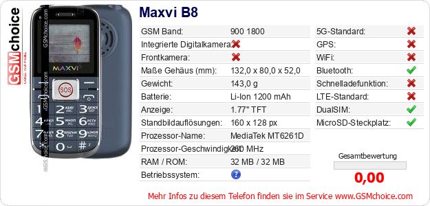 Hast du eigene Webseite? Willst du die Informationen über Standarddaten des Handys Maxvi B8 irgendwo veröffentlichen? Das ist sehr einfach. Du kannst das Bild herunterladen oder kopieren und auf der Webseite folgenden Code hinzufügen:Das Einfügen von diesem Code verursacht das Anzeigen von dem folgenden Bild: