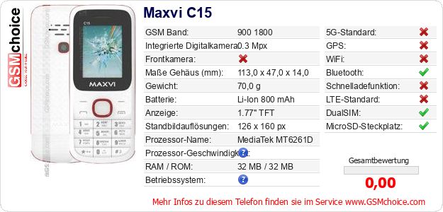 Hast du eigene Webseite? Willst du die Informationen über Standarddaten des Handys Maxvi C15 irgendwo veröffentlichen? Das ist sehr einfach. Du kannst das Bild herunterladen oder kopieren und auf der Webseite folgenden Code hinzufügen:Das Einfügen von diesem Code verursacht das Anzeigen von dem folgenden Bild: