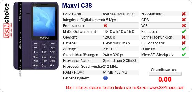 Hast du eigene Webseite? Willst du die Informationen über Standarddaten des Handys Maxvi C38 irgendwo veröffentlichen? Das ist sehr einfach. Du kannst das Bild herunterladen oder kopieren und auf der Webseite folgenden Code hinzufügen:Das Einfügen von diesem Code verursacht das Anzeigen von dem folgenden Bild: