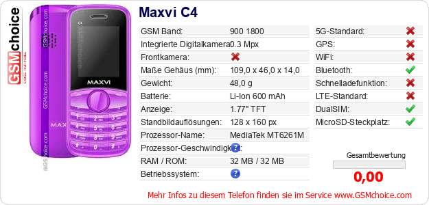 Hast du eigene Webseite? Willst du die Informationen über Standarddaten des Handys Maxvi C4 irgendwo veröffentlichen? Das ist sehr einfach. Du kannst das Bild herunterladen oder kopieren und auf der Webseite folgenden Code hinzufügen:Das Einfügen von diesem Code verursacht das Anzeigen von dem folgenden Bild: