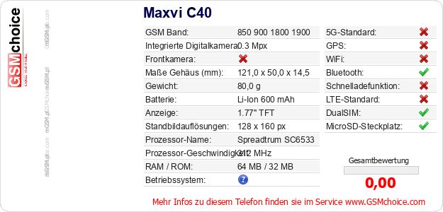 Hast du eigene Webseite? Willst du die Informationen über Standarddaten des Handys Maxvi C40 irgendwo veröffentlichen? Das ist sehr einfach. Du kannst das Bild herunterladen oder kopieren und auf der Webseite folgenden Code hinzufügen:Das Einfügen von diesem Code verursacht das Anzeigen von dem folgenden Bild: