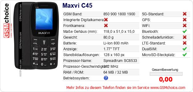 Hast du eigene Webseite? Willst du die Informationen über Standarddaten des Handys Maxvi C45 irgendwo veröffentlichen? Das ist sehr einfach. Du kannst das Bild herunterladen oder kopieren und auf der Webseite folgenden Code hinzufügen:Das Einfügen von diesem Code verursacht das Anzeigen von dem folgenden Bild: