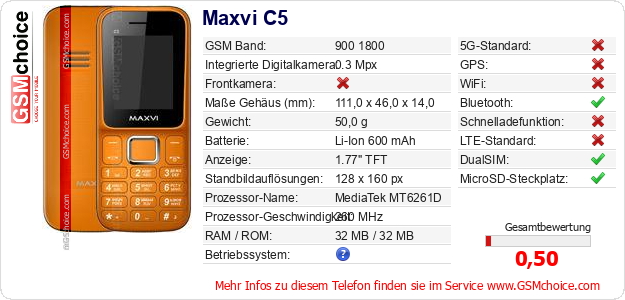 Hast du eigene Webseite? Willst du die Informationen über Standarddaten des Handys Maxvi C5 irgendwo veröffentlichen? Das ist sehr einfach. Du kannst das Bild herunterladen oder kopieren und auf der Webseite folgenden Code hinzufügen:Das Einfügen von diesem Code verursacht das Anzeigen von dem folgenden Bild: